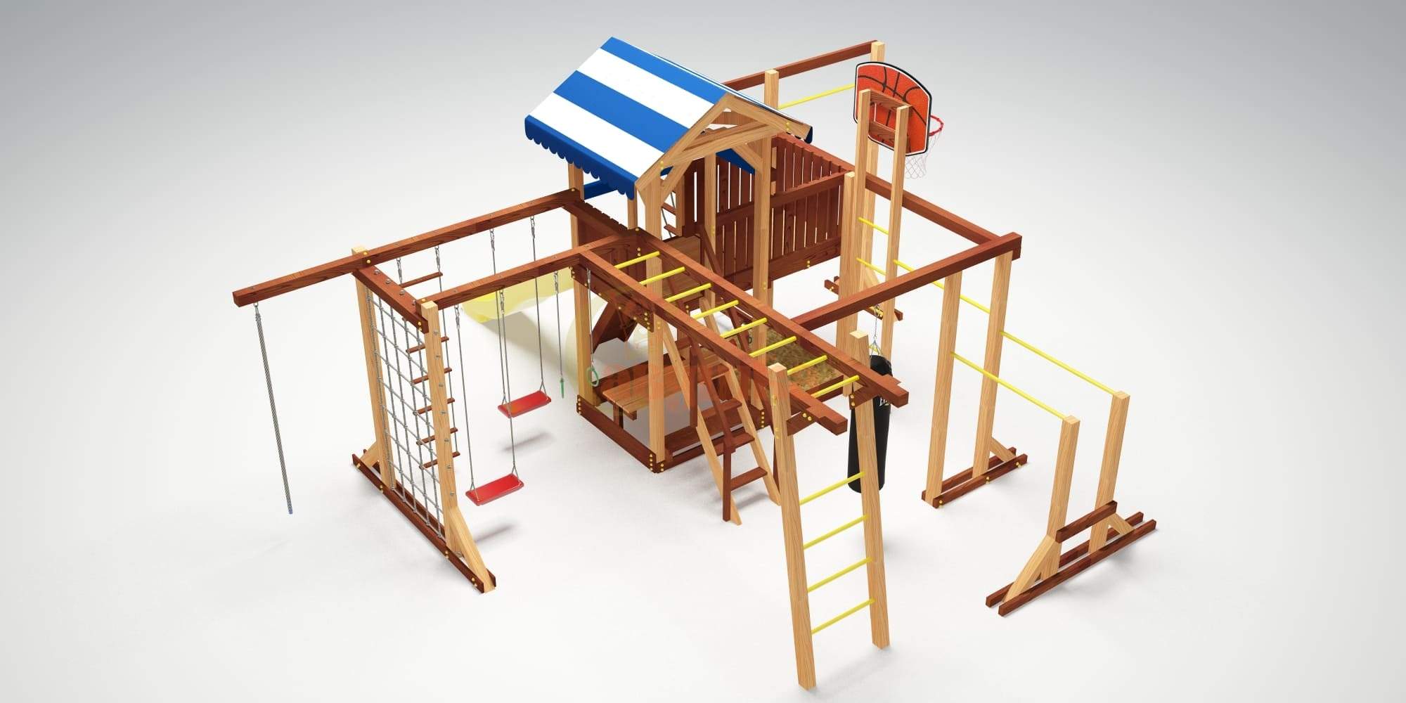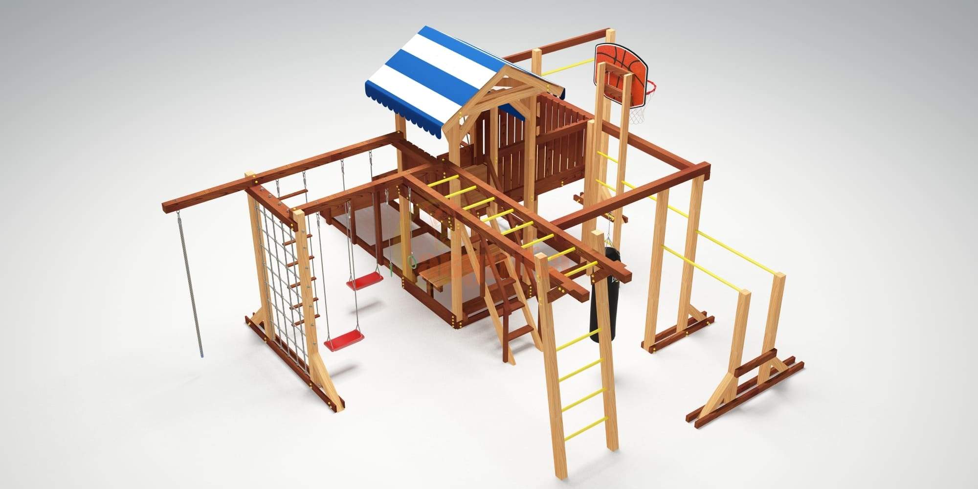 Спортивный модуль включает рукоход из 8 перекладин, двухсекционную шведскую стенку с широким и узким “шагом” для любого возраста и роста ребенка.