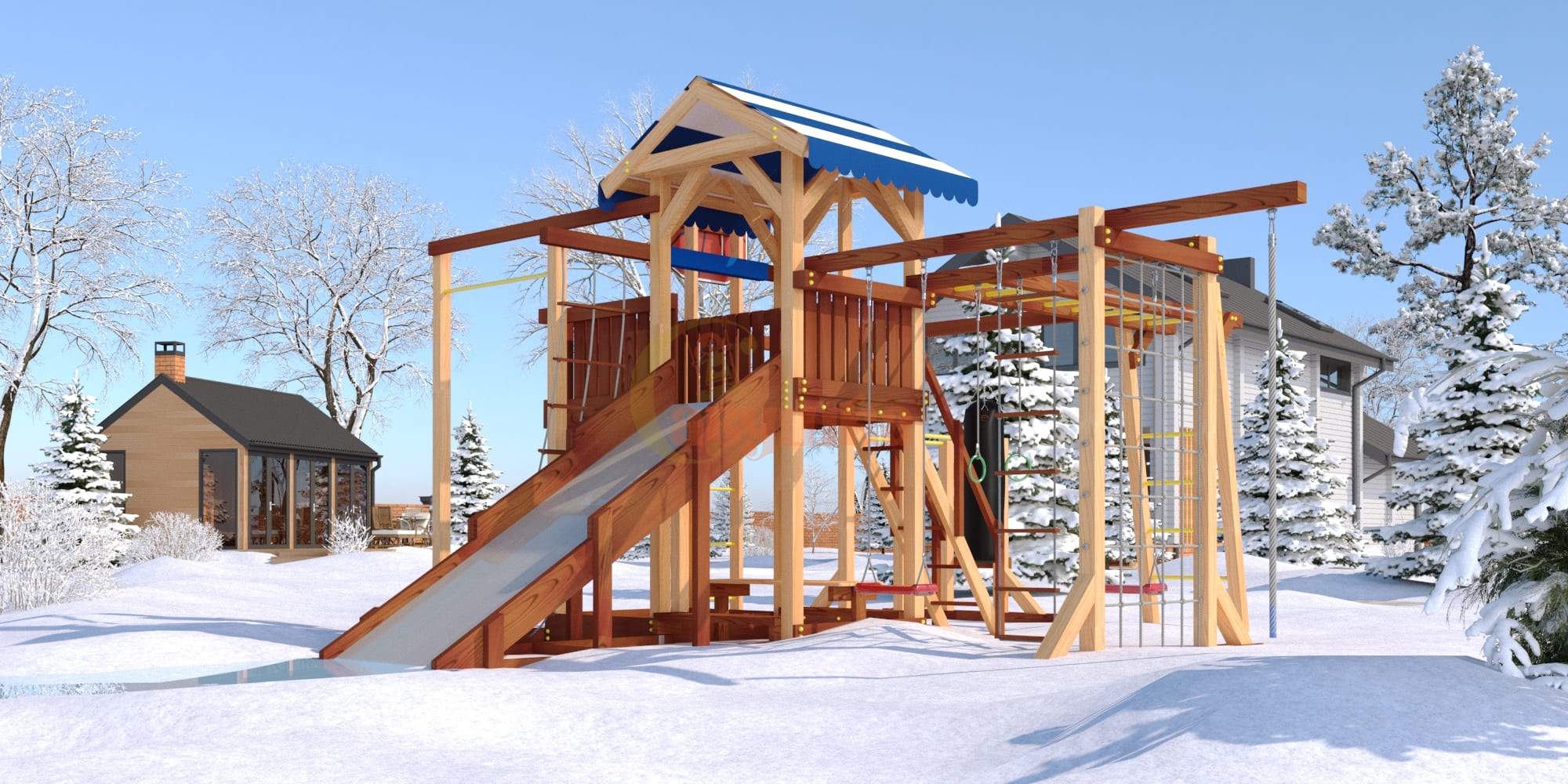 В центре комплекса - игровая башня с яркой двухцветной крышей из материала “Оксфорд”. Чтобы подняться в нее, нужно преодолеть сетку-лазалку, скалодром или лестницу-трап с узкими ступенями. Такие ежедневные мини-тренировки развивают у детей чувство равновесия, учат преодолевать страх и нерешительность. Спуститься вниз можно теми же путями, а также самым интересным и веселым - съехать по трехметровой горке. В зимний период горка может быть заменена на деревянный скат (поставляется в комплекте). Ширина ската 93 см позволяет кататься с него на ледянках и тюбингах.