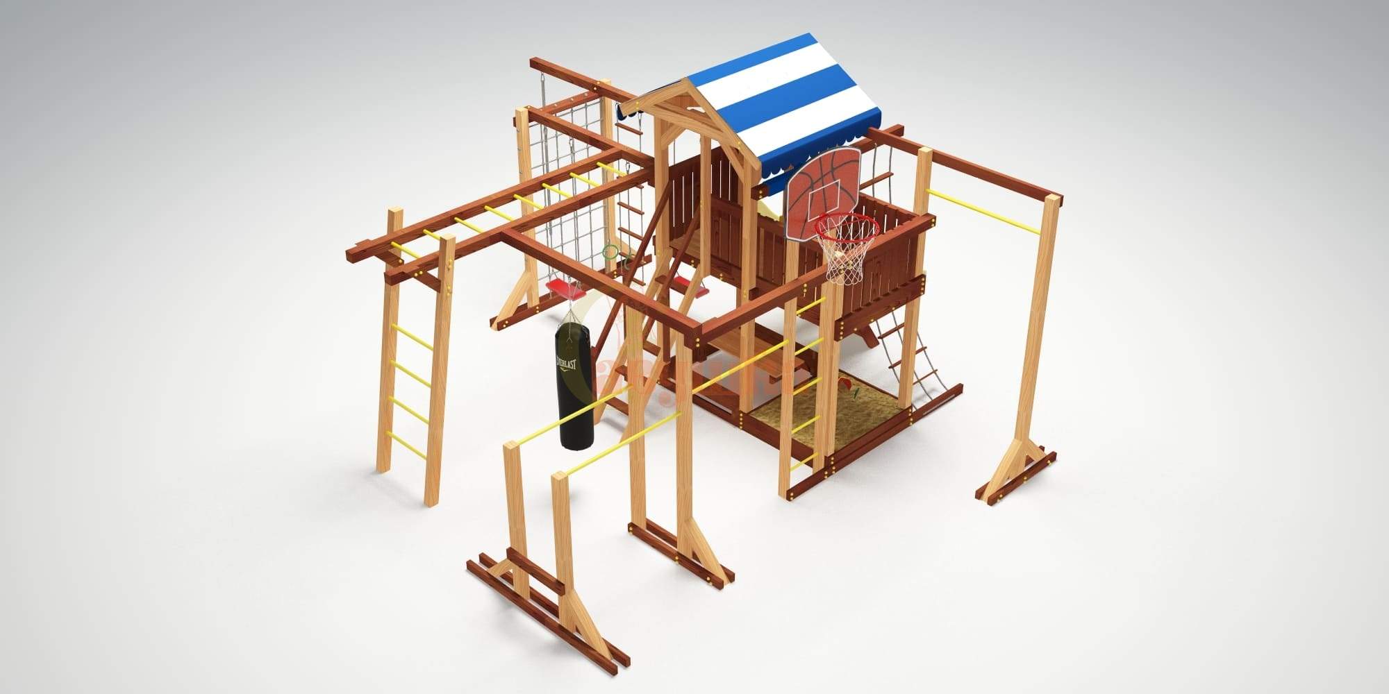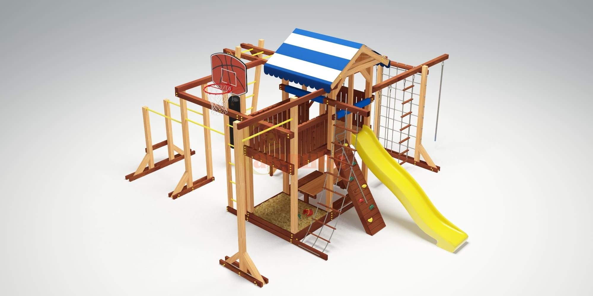 Универсальная детская площадка "Савушка-10” – современный семейный комплекс для детей от 3 до 9 лет. Экологичный каркас из клееного бруса соответствует ГОСТ - не деформируется, не расслаивается, тщательно отшлифован, все углы скруглены, крепёжные болты закрыты безопасными пластиковыми заглушками. Навесные элементы произведены в Бельгии по европейским стандартам качества и безопасности.